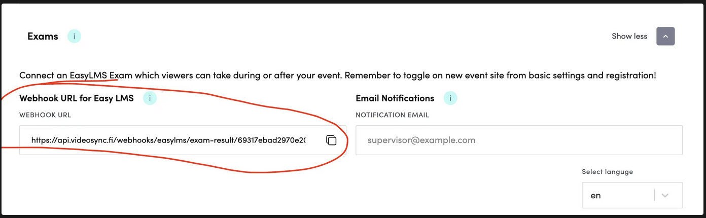1. Copy the webhook URL in your event. The Webhook URL is event specific. Add it in Easy LMS to each exam you have in the event.