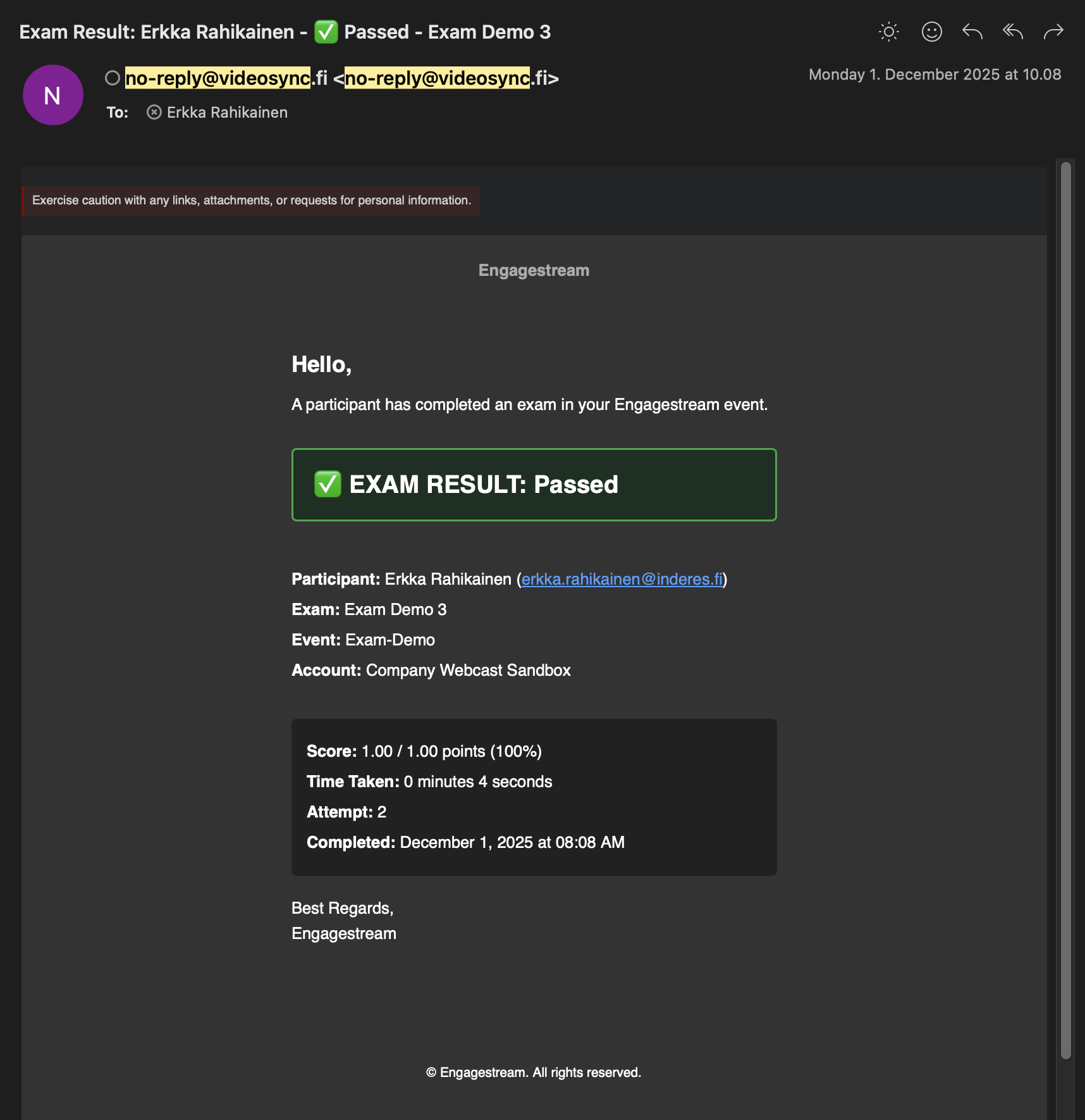 The webhook sends exam completion data including participant information and exam results. This data is displayed in the Analytics Dashboard and can trigger email notifications if configured.